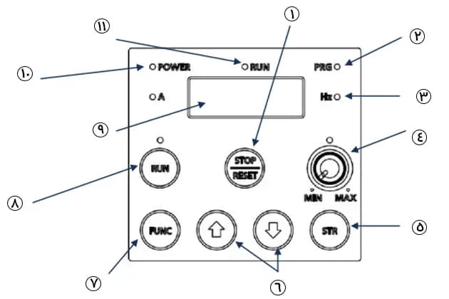 | 11 | چراغ شروع | زمانی که اینورتر ولتاژ PWM را به خروجی میدهد، این چراغ به معنای فرمان راهاندازی روشن میشود. |