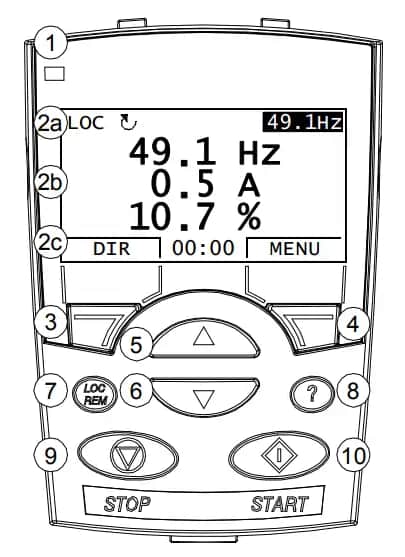| 2 | قسمت دوم نمایشگر درایو از سه بخش تشکیل شده است: 2a: خط وضعیت که بسته به حالت عملکرد تغییر میکند. 2b: بخش مرکزی نمایشگر که پارامترها، خطاها و هشدارها را نمایش میدهد. 2c: خط پایین برای نمایش وضعیت فعلی، و در صورت فعال بودن نمایش ساعت. |